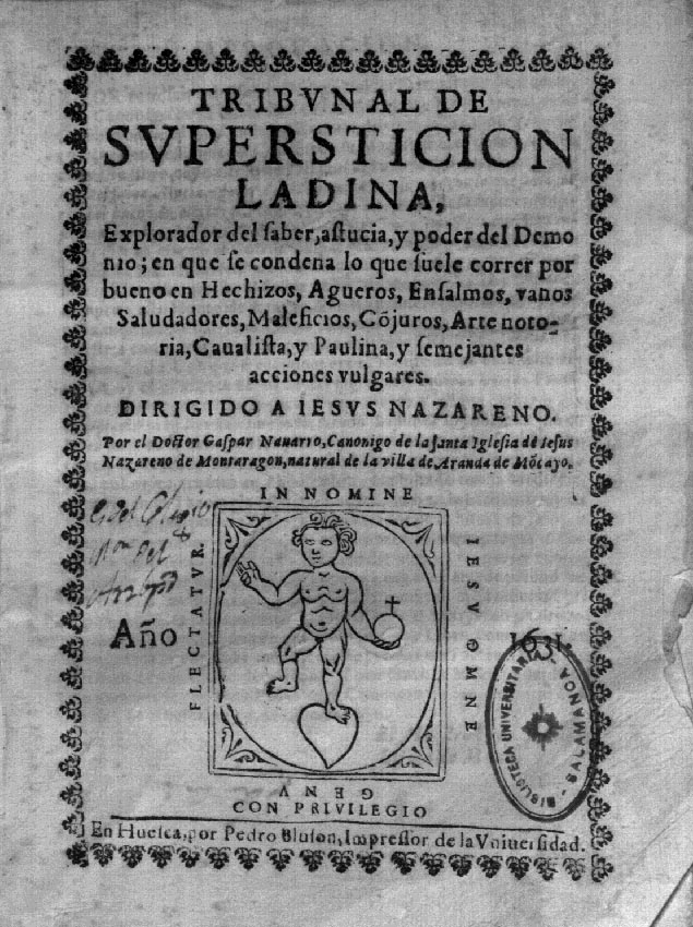 Se escribieron múltiples tratados y compendios sobre la figura del demonio y la forma de combatirlo, adiestrando a los exorcistas cual soldados de Dios contra las fuerzas infernales. En 1631, diez años después de subir al trono Felipe IV, el doctor Gaspar Navarro, canónigo de Montearagón, publicó un pintoresco y no poco extravagante compendio de supersticiones demoníacas que entonces eran consideradas por muchos de sentido común, en un libro titulado Tribunal de superstición ladina. En él, dividido en 37 capítulos, sus tesis demoníacas, llamadas «Disputas», donde pretendía ridiculizar muchas de aquellas creencias, tenían títulos tan sugerentes como «Del saber que tiene el Demonio para revelar a los adivinos»; «Si puede el demonio conservar un cuerpo vivo sin comer, y de algunas cosas que hacen en los cuerpos muertos de sus amigos los magos, que parecen milagrosas y no lo son, como son hablar y conservarlos sin corrupción alguna»; «Apariciones así de demonios como de almas»; «De los raptos de los hechiceros que vulgarmente llaman arrobos. Y del maleficio que usa el Demonio con las brujas para sufrir los tormentos». Muy sugerente, y ciertamente escéptico en tiempos donde empezaba a decaer la brujomanía en el Viejo Continente, no así en el Nuevo, donde aún faltaban varias décadas para que se celebraran los celebérrimos e ignominiosos Juicios de Salem.