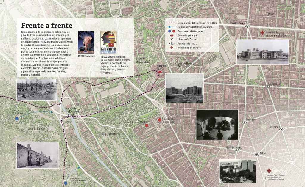 En sus monumentales páginas –el «tocho» pesa alrededor de 2 kilos– podemos ver qué ha quedado de batallas como Jarama, Brunete, Belchite… pero también se abordan episodios mucho menos conocidos y no por ello poco relevantes, como el asedio de Huesca, la batalla de Lopera o de Cabo Machichaco, la fuga del penal de San Cristóbal y un largo etcétera. Evidentemente, como afirman los autores, hubo que hacer una difícil selección previa o el libro estaría formado por varios volúmenes de gran tamaño.