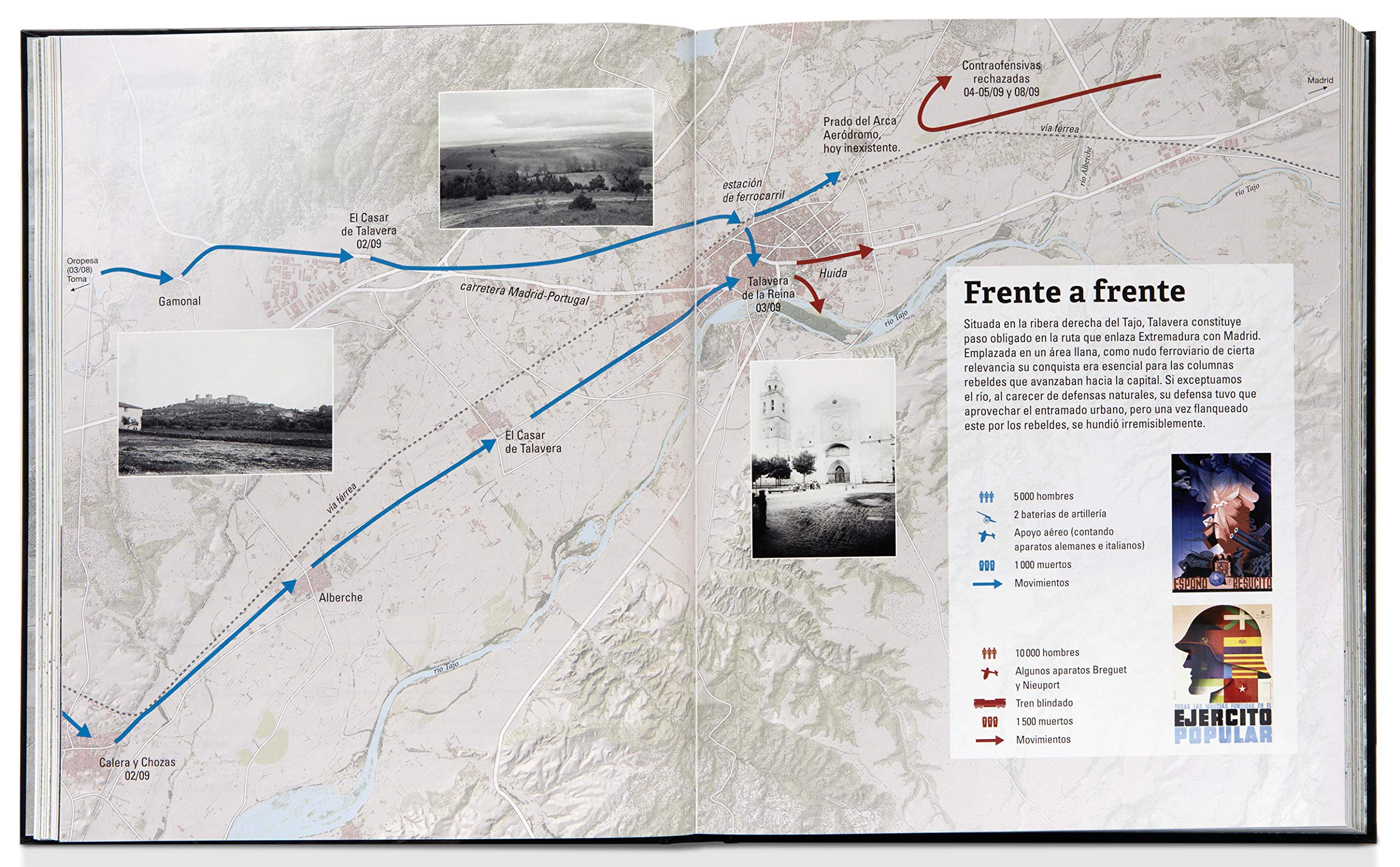 En sus monumentales páginas –el «tocho» pesa alrededor de 2 kilos– podemos ver qué ha quedado de batallas como Jarama, Brunete, Belchite… pero también se abordan episodios mucho menos conocidos y no por ello poco relevantes, como el asedio de Huesca, la batalla de Lopera o de Cabo Machichaco, la fuga del penal de San Cristóbal y un largo etcétera. Evidentemente, como afirman los autores, hubo que hacer una difícil selección previa o el libro estaría formado por varios volúmenes de gran tamaño.