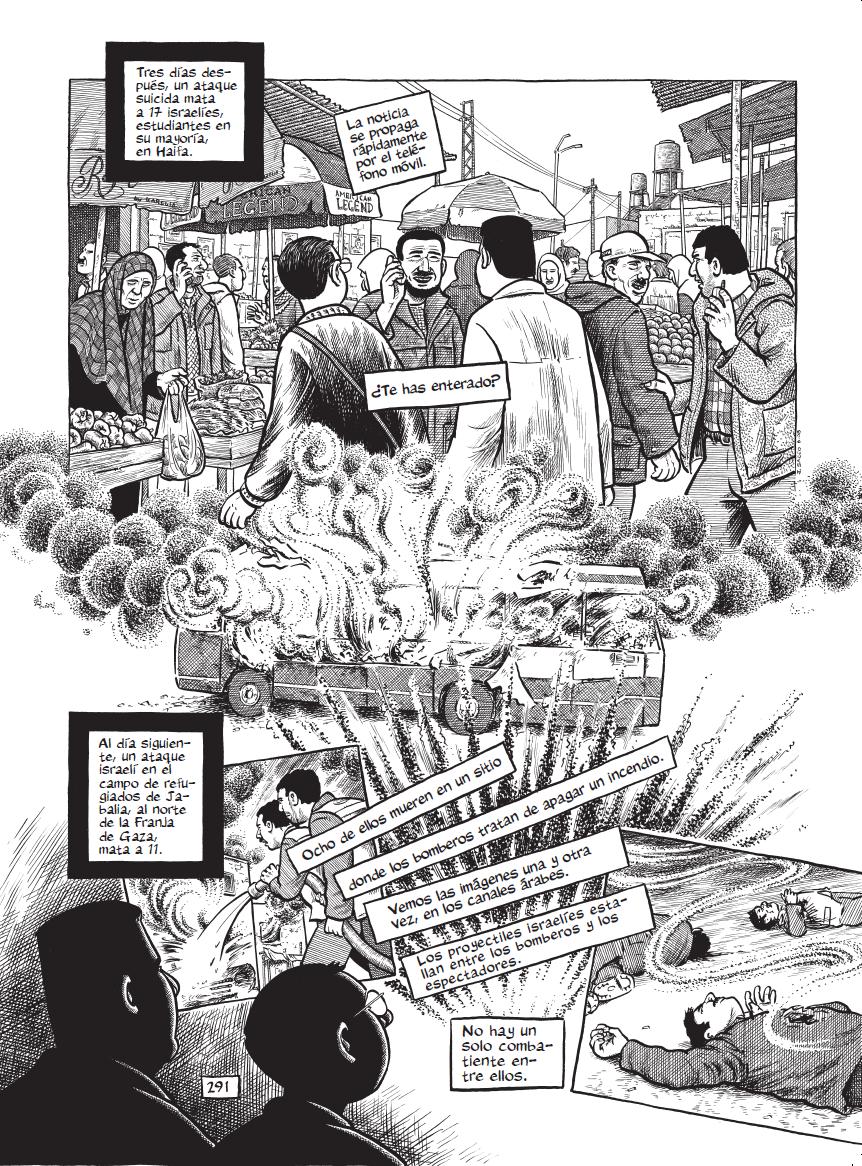 Una de las cosas más destacables del relato es su trasfondo, y es el hecho de que mientras el periodista investiga unos terribles hechos de hace 50 años, en esa misma franja de Gaza el conflicto sigue –seguía– vivo, las tensiones se palpan en el ambiente, el odio no conoce el paso del tiempo (otros dirán que tampoco el perdón). Qué utilidad tiene –reflexiona Sacco– escarbar en unos hechos tan lejanos cuando hoy no pasan muchas semanas sin que se produzca un atentado palestino en suelo judío, sin que algún manifestante resulte herido –o muerto– a manos de las fuerzas policiales israelíes, sin que una casa sea derribada por orden del gobierno en base a unos enrevesados conflictos fronterizos…