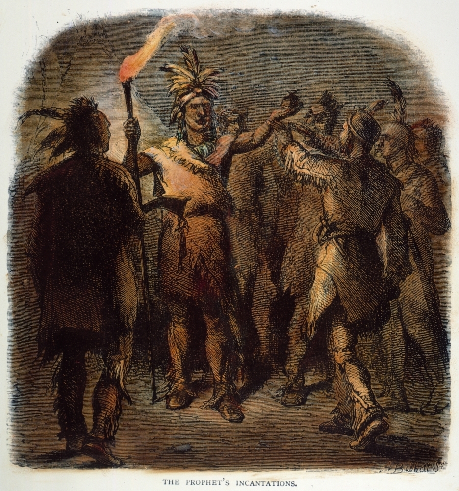 Eran tiempos de exacerbamiento religioso que se acentuó por la guerra y en 1805 Tecumseh ganó un extraño aliado en su hermano pequeño aficionado a la bebida, Lalawethika, que tras llevar una vida disoluta cayó en trance y dijo haber experimentado una visión del Gran Espíritu, que le pidió que purificase su estilo de vida. Adoptó el nombre de Tenskwatawa («La Puerta Abierta») y fue conocido a partir de entonces como El Profeta (de ahí el sentido del título del ensayo que recomendamos) y sus postulados cosecharon un gran impulso hasta que los hermanos fundaron una aldea en la tierra de Delaware conocida como Prophet’s Town («La ciudad del Profeta»), donde se pidió un regreso a las tradiciones nativas, y se prohibió el consumo de alcohol, vestir a la manera occidental y los matrimonios mixtos, reforzando la visión profundamente mística de Tecumseh de una nación nativa independiente.