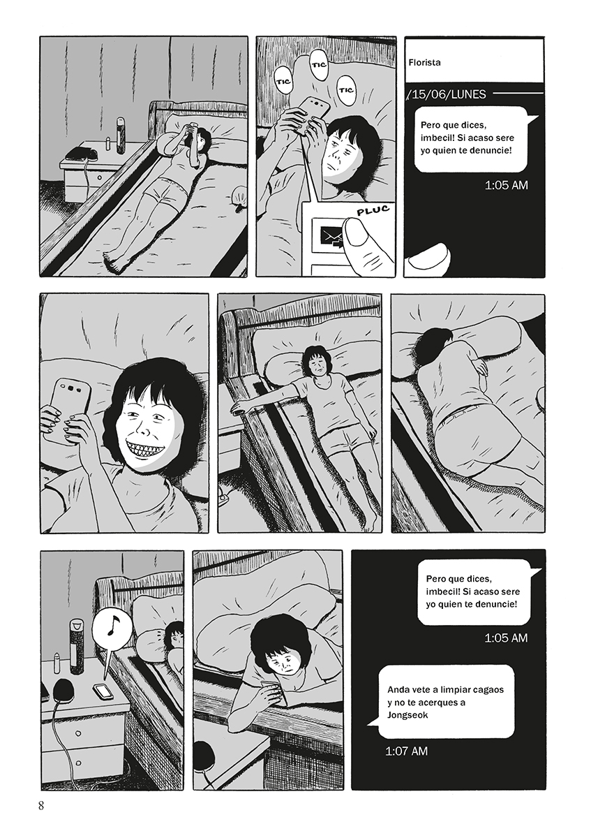 Por su parte, Lee Soyeon, otra mujer divorciada de 50 años, trabaja como limpiadora en un edificio de apartamentos en Seúl, aguantando a unos jefes explotadores y despreciables. Su situación en casa no es mucho mejor: su hijo treintañero es un derrochador (no de su dinero, sino del de su madre) y una suerte de parásito, y su novio, Jongseok, es otro perdedor sin horizonte (lo que dice mucho sobre el retrato que el autor pinta del género masculino al que pertenece), un tipo que se tiró tres años engañando a Soyeon y ella, sabiéndolo, es incapaz de dejarle, lo que barniza su vida, si cabe, de una mayor pátina de patetismo, en ocasiones innato al género humano. Myeong-ok, por otro lado, sale con un hombre más joven que ella, pero tampoco vive precisamente en un mundo de ensueño.