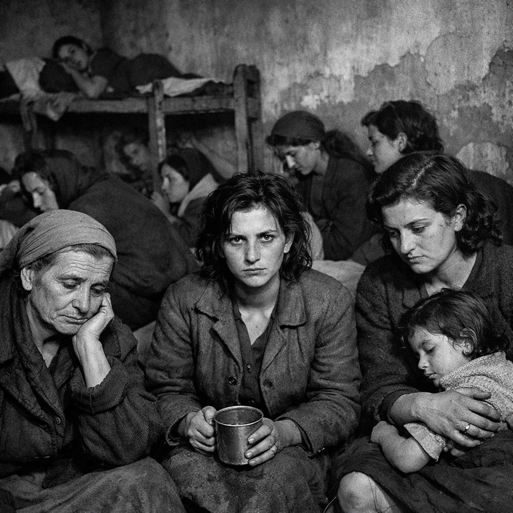 Women and children sitting closely together in a worn shelter with distressed expressions