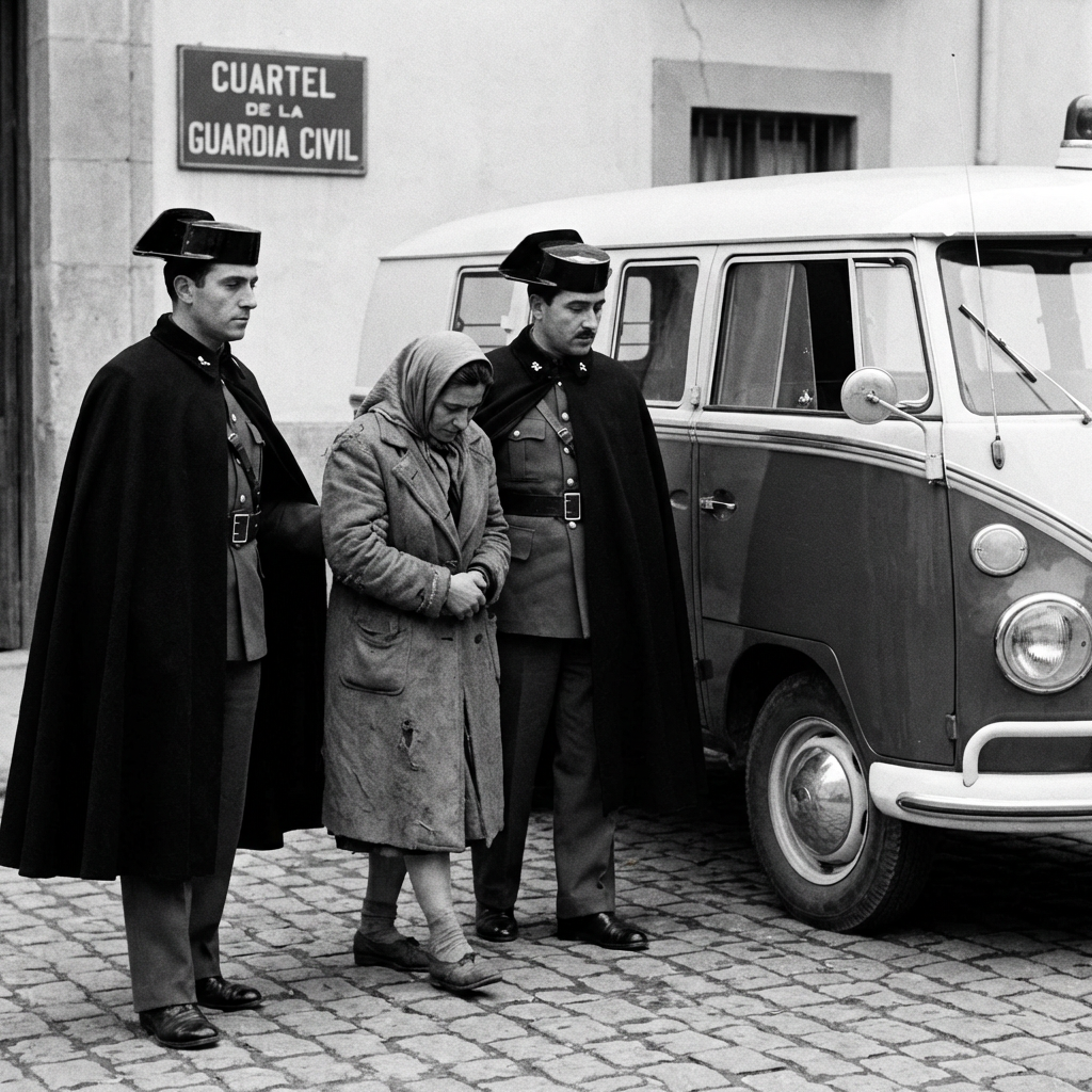 Two Guardia Civil officers in uniform escorting a woman detainee beside a police van