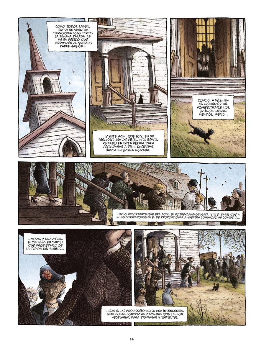 No era la típica historia que me llamara la atención en un primer momento, pero cuando me la recomendó la jefa de prensa de Norma Editorial estaba claro que me toparía con una buena novela gráfica. Y he de decir que no me decepcionó. Al contrario, caí rendido a su dibujo y su historia. Una narración que tiene lugar a principios del siglo pasado en un pueblecito rural y semi aislado de Canadá, Notre-Dame des Lacs (existe realmente una muy similar, Notre-Dame du Lac, en el municipio regional del condado de Témiscouata, en la provincia de Quebec), pero cuya esencia podría extrapolarse a cualquier rincón del mundo en cualquier tiempo.
