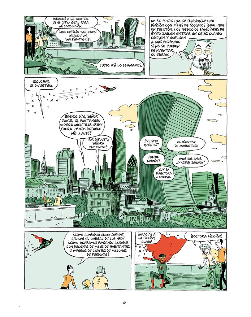 El propio Harari cobra vida en la viñeta (aún a pesar de sus reticencias iniciales) y aparece en las páginas gráficas de Sapiens en su faceta de profesor y divulgador, contando cosas sorprendentes a su sobrina, sus compañeros de la Universidad o a través de conferencias, narrando al lector en tercera persona, un acierto sin duda a la hora de convertir la temática del ensayo en trazos y color.